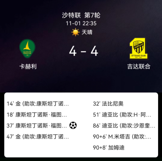 第90+8分钟(进球):吉达联合绝平比分!费萨尔-加姆迪破门,最终4-4战平。