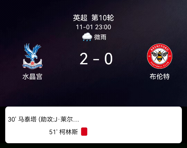 北京时间11月1日,英格兰足球超级联赛第10轮,水晶宫迎战布伦特福德。第30分钟,马特塔头球破门,水晶宫1-0;第43分钟,布伦特福德球员吃黄;第51分钟,科林斯头球乌龙,水晶宫2-0。最终比分,水晶宫2-0布伦特福德。