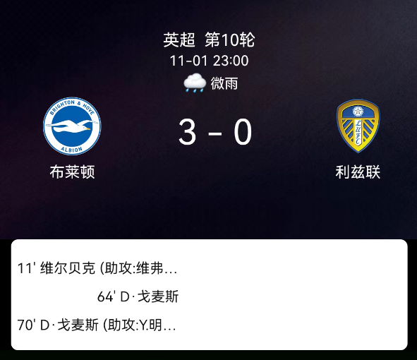 北京时间11月1日,英超联赛第10轮,布莱顿迎战利兹联。第11分钟,魏费尔助攻维尔贝克推射破门,布莱顿1-0;第45分钟,利兹联球员吃黄;第64分钟,迭戈-戈麦斯包抄破门,布莱顿2-0;第70分钟,迭戈-戈麦斯再破门,布莱顿3-0。最终比分,布莱顿3-0利兹联。