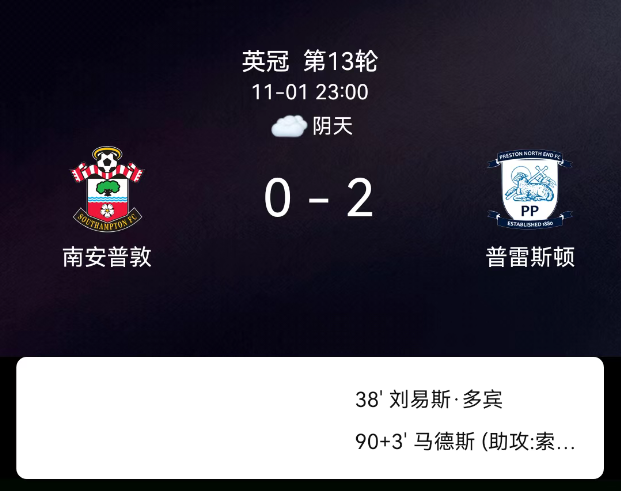 北京时间11月1日,英格兰足球冠军联赛第13轮,南安普顿迎战普雷斯顿。第38分钟,刘易斯-多宾破门,普雷斯顿1-0;第55分钟,南安普顿球员吃黄;下半场补时第4分钟,波尔奥尔松助攻弗罗凯-延森破门,普雷斯顿2-0。最终比分,南安普顿0-2普雷斯顿。