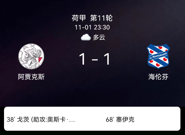 北京时间11月1日,荷兰甲级联赛第11轮,阿贾克斯迎战海伦芬。第38分钟,格洛赫助攻米卡-古茨破门,阿贾克斯1-0;第55分钟,海伦芬球员吃黄;第68分钟,塞克破门,海伦芬1-1。最终比分,阿贾克斯1-1海伦芬。