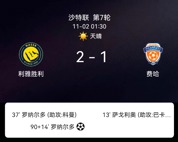 北京时间11月2日,沙特阿拉伯职业足球联赛第7轮,利雅得胜利迎战费哈。第12分钟,雷梅塞罗破门,费哈1-0;第37分钟,科曼助攻C罗破门,利雅得胜利1-1;第63分钟,菲利克斯吃黄;第90+14分钟,C罗点射绝杀,利雅得胜利2-1。最终比分,利雅得胜利2-1费哈。