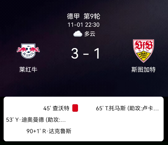 北京时间11月1日,德国足球甲级联赛第9轮,RB莱比锡迎战斯图加特。第45分钟,沙博特自摆乌龙,莱比锡1-0;第53分钟,迪奥曼德内切破门,莱比锡2-0;第65分钟,蒂亚戈-托马斯单刀破门,斯图加特1-2;第78分钟,斯图加特球员吃黄;第90+2分钟,努贝尔失误,罗慕洛破门,莱比锡3-1。最终比分,RB莱比锡3-1斯图加特。