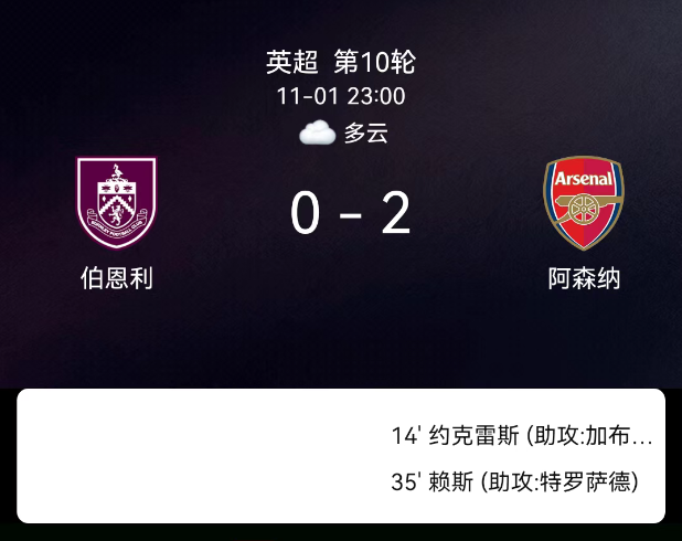 北京时间11月1日,英超联赛第10轮,伯恩利迎战阿森纳。第14分钟,哲凯赖什顶空门破门,阿森纳1-0;第35分钟,特罗萨德助攻赖斯头球破门,阿森纳2-0;第54分钟,弗莱明吃黄。最终比分,伯恩利0-2阿森纳。