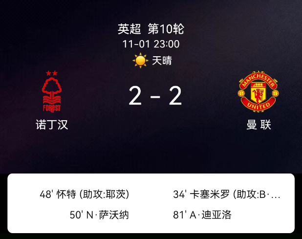 北京时间11月1日23:00,英超第10轮,诺丁汉森林迎战曼联。第34分钟,B费助攻卡塞米罗头球破门,曼联1-0;第49分钟,吉布斯-怀特头球破门,森林1-1;第50分钟,萨沃纳乱战破门,森林2-1;第68分钟,曼联球员吃黄;第81分钟,阿马德-迪亚洛轰世界波,曼联2-2。最终比分,诺丁汉森林2-2曼联。