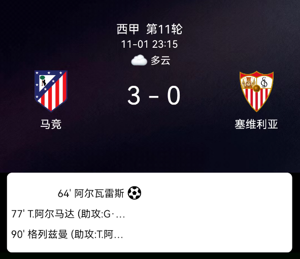 北京时间11月1日23:00,西甲第11轮,马德里竞技迎战塞维利亚。第64分钟,夸西犯规送点,小蜘蛛点射破门,马竞1-0;第72分钟,塞维利亚球员吃黄;第78分钟,小西蒙尼助攻阿尔马达破门,马竞2-0;第89分钟,阿尔马达策动进攻助格列兹曼破门,马竞3-0。最终比分,马德里竞技3-0塞维利亚。
