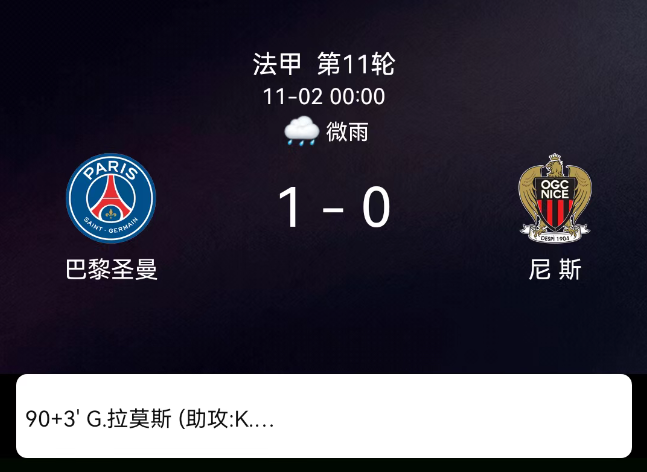 北京时间11月2日,法国足球甲级联赛第11轮,巴黎圣日耳曼迎战尼斯。第27分钟,阿卜杜拉-朱马-巴拉人吃黄;第33分钟,克瓦拉茨赫利亚门线解围;第90+4分钟,贡萨洛-拉莫斯头球绝杀,巴黎1-0。最终比分,巴黎圣日耳曼1-0尼斯。