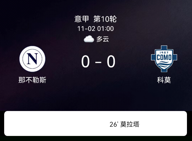 北京时间11月2日,意大利足球甲级联赛第10轮,那不勒斯迎战科莫。第27分钟,莫拉塔造点后亲自主罚被米林科维奇扑出;第74分钟,埃尔马斯吃黄。最终比分,那不勒斯0-0科莫。