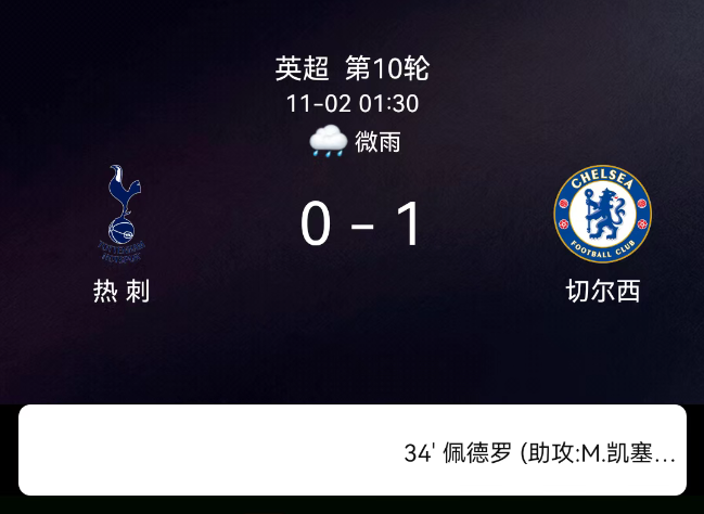 北京时间11月2日,英格兰足球超级联赛第10轮,热刺迎战切尔西。第34分钟,凯塞多抢断助攻若昂-佩德罗破门,切尔西1-0;第45+4分钟,本坦库尔吃黄;第60分钟,哈维-西蒙斯吃黄;第69分钟,恩佐吃黄。最终比分,热刺0-1切尔西。