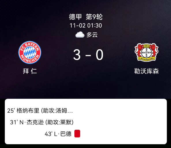 北京时间11月2日1:30,德甲第9轮焦点战,拜仁迎战勒沃库森。第25分钟,比朔夫助攻格纳布里破门,拜仁1-0;第31分钟,莱默尔助攻雅克松头球破门(德甲首球),拜仁2-0;第43分钟,巴代自摆乌龙,拜仁3-0;第64分钟,马扎吃黄;第90分钟,格雷茨卡吃黄。最终比分,拜仁慕尼黑3-0勒沃库森。