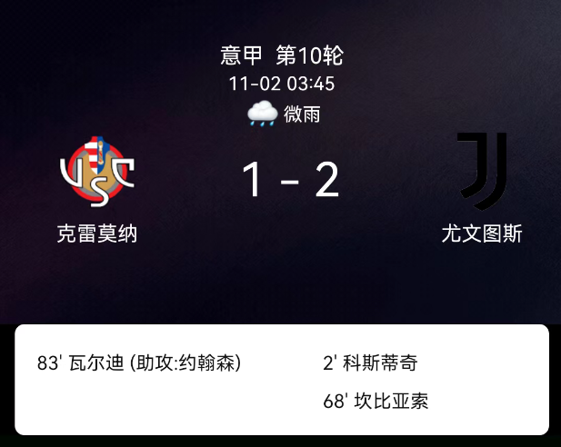 北京时间11月2日,意大利足球甲级联赛第10轮,克雷莫内塞主场迎战尤文图斯。第2分钟,科斯蒂奇后点插上推射破门,尤文1-0;第68分钟,坎比亚索补射破门,尤文2-0;第83分钟,约翰森助攻瓦尔迪低射破门,克雷莫内塞1-2。最终比分,克雷莫内塞1-2尤文图斯。