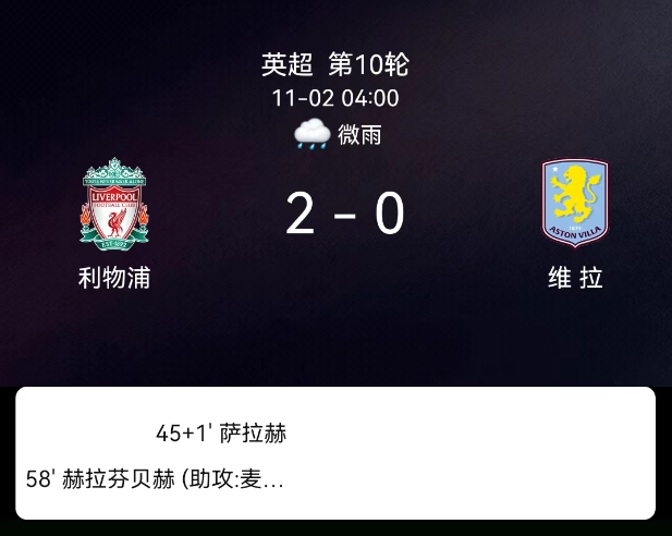 北京时间11月2日,英格兰足球超级联赛第10轮,利物浦主场迎战阿斯顿维拉。第45+2分钟,大马丁出球失误,萨拉赫破门,利物浦1-0;第58分钟,赫拉芬贝赫远射折射入网,利物浦2-0。最终比分,利物浦2-0阿斯顿维拉,终结连败。