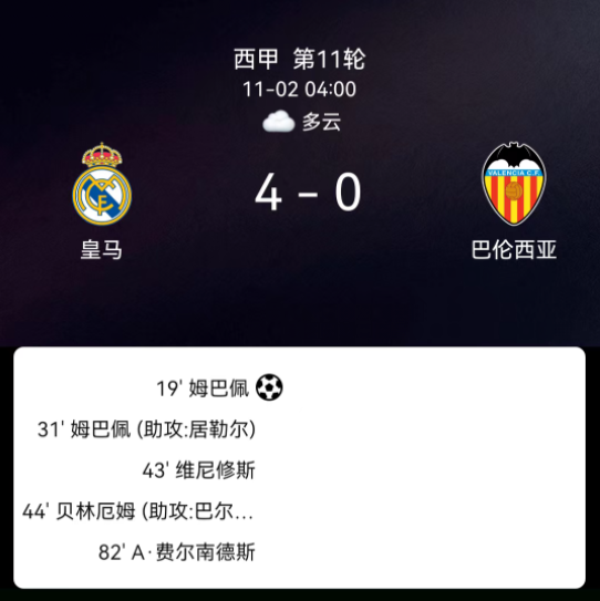 北京时间11月2日,西班牙足球甲级联赛第11轮,皇马主场迎战瓦伦西亚。第20分钟,客队手球送点,姆巴佩主罚命中,皇马1-0;第31分钟,居莱尔助攻,姆巴佩凌空垫射破门,皇马2-0;第44分钟,巴尔韦德助攻,贝林厄姆兜射破门,皇马3-0;第84分钟,卡雷拉斯世界波破门,皇马4-0。最终比分,皇家马德里4-0瓦伦西亚,迎6连胜。