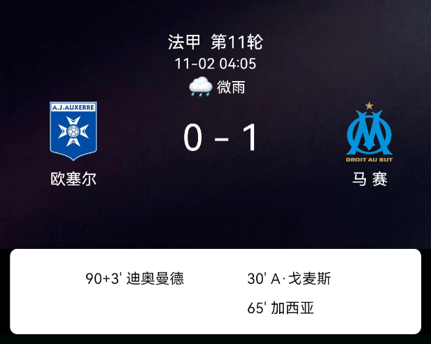 北京时间11月2日,法国足球甲级联赛第11轮,欧塞尔主场迎战马赛。第30分钟,戈梅斯门前补射破门,马赛1-0;第65分钟,加西亚铲球犯规被红牌罚下;第90+3分钟,迪奥曼德累计两黄被罚下。最终比分,欧塞尔0-1马赛。