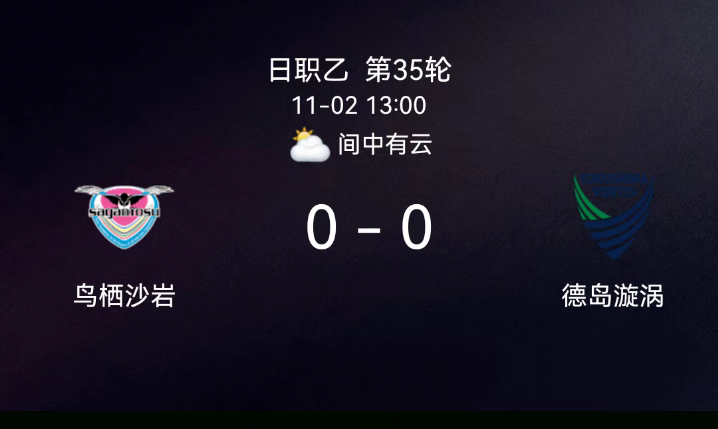 北京时间11月2日,日本职业联赛J2第35轮,鸟栖砂岩主场对阵德岛漩涡。全场比赛双方未能突破对方防线,均未取得进球。最终比分,鸟栖砂岩0-0德岛漩涡。