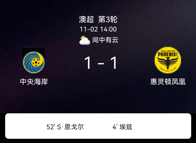 北京时间11月2日,澳大利亚足球超级联赛第3轮,中央海岸水手主场迎战惠灵顿凤凰。第4分钟,IfeanyiEze补射破门,惠灵顿1-0;第52分钟,塞比特-恩戈尔补射扳平,中央海岸1-1;第75分钟,中央海岸水手的哈里松-斯蒂莱吃到黄牌。最终比分,中央海岸水手1-1惠灵顿凤凰。