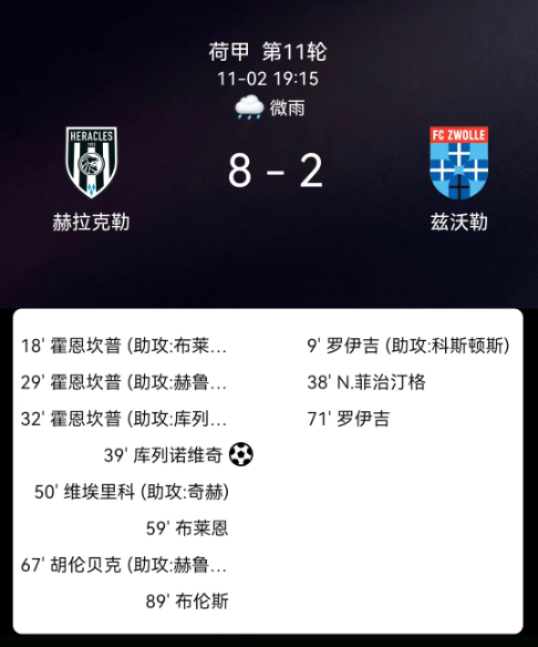 北京时间11月2日,荷兰甲级联赛第11轮,赫拉克勒主场对阵兹沃勒。第9分钟,德罗伊破门,兹沃勒1-0;第18分钟,霍恩坎普破门,赫拉克勒1-1;第29分钟,霍恩坎普再破门,赫拉克勒2-1;第32分钟,霍恩坎普戴帽,赫拉克勒3-1;第38分钟,菲赫廷格染红,兹沃勒十人应战;第39分钟,库莱诺维奇点球破门,赫拉克勒4-1;第50分钟,特维里克破门,赫拉克勒5-1;第59分钟,林邦贝破门,赫拉克勒6-1;第67分钟,范霍伦贝克破门,赫拉克勒7-1;第71分钟,德罗伊梅开二度,兹沃勒2-7;第89分钟,布伦斯破门,赫拉克勒8-2。最终比分,赫拉克勒8-2兹沃勒。