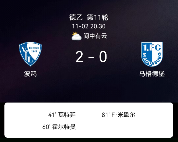 北京时间11月2日,德国足球乙级联赛第11轮,波鸿主场迎战马格德堡。第41分钟,魏特延破门,波鸿1-0;第60分钟,霍尔特曼破门,波鸿2-0。最终比分,波鸿2-0马格德堡。