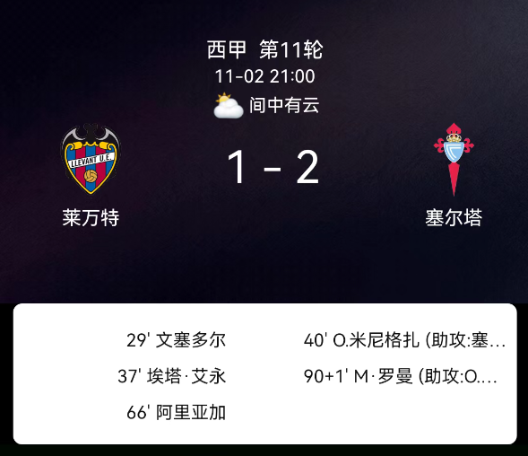北京时间11月2日,西班牙足球甲级联赛第11轮,莱万特主场迎战塞尔塔。第29分钟,文塞多尔染红,莱万特十人应战;第40分钟,塞尔希奥-卡雷拉助攻明格萨破门,塞尔塔1-0;第66分钟,阿里亚加破门,莱万特1-1;下半场补时第1分钟,明格萨助攻米格尔-罗曼破门,塞尔塔2-1。最终比分,莱万特1-2塞尔塔。
