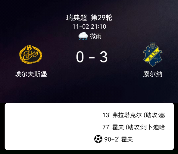 北京时间11月2日,瑞典足球超级联赛第29轮,埃尔夫斯堡主场迎战AIK索尔纳。第13分钟,塞利纳助攻弗拉塔克破门,AIK索尔纳1-0;第77分钟,阿卜迪哈金-阿里助攻约翰-霍弗破门,AIK索尔纳2-0;下半场补时第2分钟,约翰-霍弗罚入点球,AIK索尔纳3-0。最终比分,埃尔夫斯堡0-3AIK索尔纳。