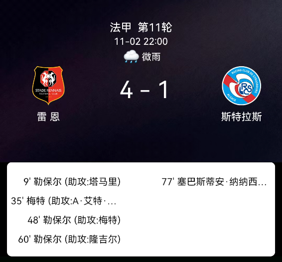 北京时间11月2日,法国足球甲级联赛第11轮,雷恩主场迎战斯特拉斯堡。第9分钟,勒保罗破门,雷恩1-0;第35分钟,穆罕默德-梅特破门,雷恩2-0;第48分钟,勒保罗再破门,雷恩3-0;第60分钟,勒保罗戴帽,雷恩4-0;第77分钟,纳纳西破门,斯特拉斯堡1-4。最终比分,雷恩4-1斯特拉斯堡。