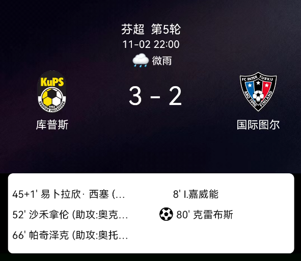 北京时间11月2日,芬兰足球超级联赛争冠组第5轮,库普斯主场对阵图尔库国际。第8分钟,耶尔维宁破门,图尔库国际1-0;上半场补时第1分钟,易卜拉欣-西塞破门,库普斯1-1;第52分钟,萨瓦莱宁破门,库普斯2-1;第66分钟,帕兹切克破门,库普斯3-1;第80分钟,克雷布斯点球破门,图尔库国际2-3。最终比分,库普斯3-2图尔库国际。
