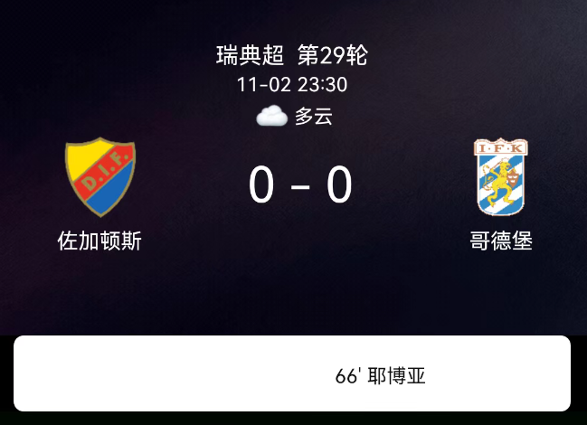 北京时间11月2日,瑞典足球超级联赛第29轮,佐加顿斯主场迎战哥德堡。第66分钟,RocksonYeboah染红,哥德堡十人应战;全场双方无进球产生。最终比分,佐加顿斯0-0哥德堡。