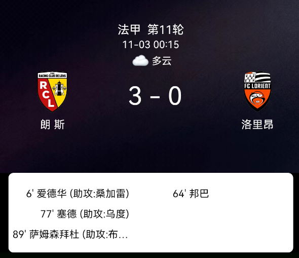 北京时间11月3日,法甲联赛第11轮,朗斯主场迎战洛里昂。第6分钟,爱德华破门,朗斯1-0;第77分钟,韦斯利-赛义德破门,朗斯2-0;第89分钟,拜多破门,朗斯3-0。最终比分,朗斯3-0洛里昂。