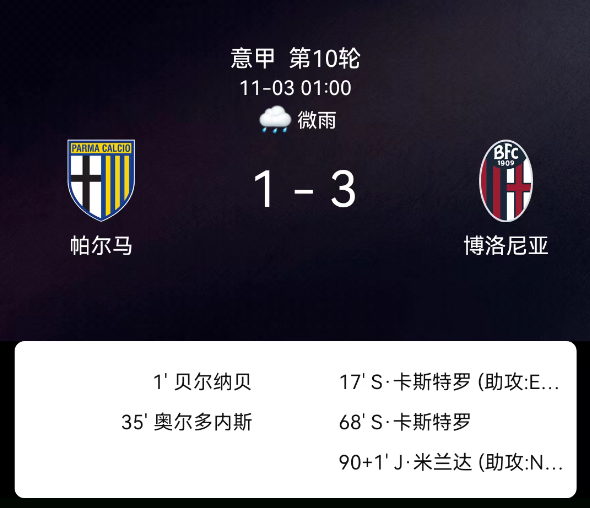 北京时间11月3日,意大利足球顶级联赛第10轮,帕尔马主场对阵博洛尼亚。第1分钟,阿德里安-贝尔纳韦破门,帕尔马1-0;第17分钟,圣地亚哥-卡斯特罗破门,博洛尼亚1-1;第35分钟,克里斯蒂安-奥多涅斯染红,帕尔马十人应战;第68分钟,圣地亚哥-卡斯特罗再破门,博洛尼亚2-1;下半场补时第2分钟,胡安-米兰达破门,博洛尼亚3-1。最终比分,帕尔马1-3博洛尼亚。