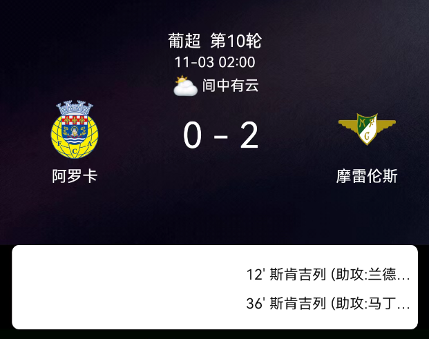 北京时间11月3日,葡萄牙足球超级联赛第10轮,阿罗卡主场迎战摩雷伦斯。第12分钟,吉列尔梅-谢蒂内破门,摩雷伦斯1-0;第36分钟,吉列尔梅-谢蒂内再破门,摩雷伦斯2-0。最终比分,阿罗卡0-2摩雷伦斯。