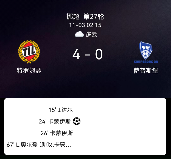 北京时间11月3日,挪威足球超级联赛第27轮,特罗姆瑟主场迎战萨普斯堡。第15分钟,耶特-达尔破门,特罗姆瑟1-0;第24分钟,IeltsinCames点球破门,特罗姆瑟2-0;第26分钟,IeltsinCames再破门,特罗姆瑟3-0;第67分钟,拉尔斯-拉森破门,特罗姆瑟4-0。最终比分,特罗姆瑟4-0萨普斯堡。