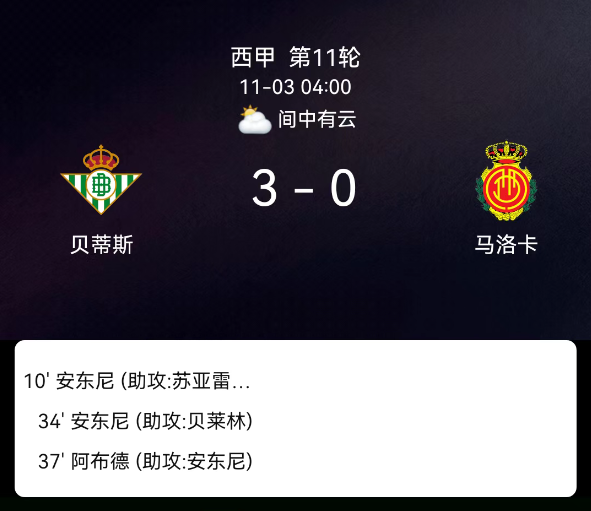 北京时间11月3日,西班牙足球甲级联赛第11轮,皇家贝蒂斯主场迎战马略卡。第10分钟,安东尼破门,贝蒂斯1-0;第34分钟,安东尼再破门,贝蒂斯2-0;第37分钟,阿布德破门,贝蒂斯3-0。最终比分,皇家贝蒂斯3-0马略卡。