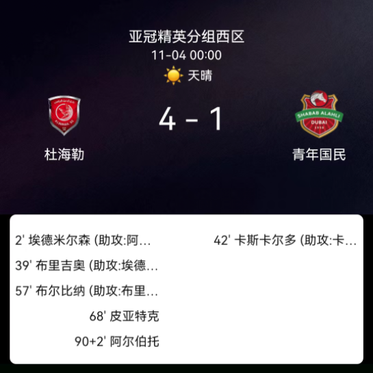 北京时间11月4日,亚足联冠军精英联赛第4轮,杜海勒迎战迪拜青年国民。第2分钟,埃德米尔森-儒尼奥尔破门,杜海勒1-0;第17分钟,迪拜青年国民吃黄牌;第39分钟,布里若破门,杜海勒2-0;第42分钟,布雷诺-莱莫斯破门,迪拜青年国民1-2;第57分钟,布勒比纳破门,杜海勒3-1;第69分钟,迪拜青年国民再吃黄牌;下半场补时第2分钟,路易斯-阿尔贝托破门,杜海勒4-1;补时阶段杜海勒获2张黄牌。最终比分,杜海勒4-1迪拜青年国民。