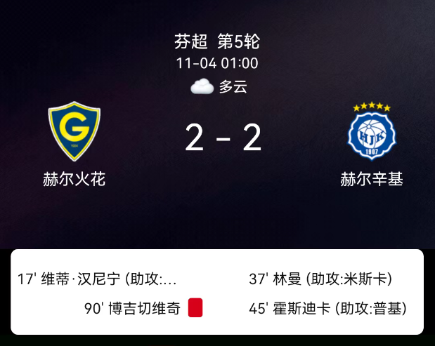 北京时间11月4日,芬兰足球超级联赛争冠组第5轮,赫尔火花主场迎战赫尔辛基。第17分钟,Vertti-Hnninen破门,赫尔火花1-0;第37分钟,林曼破门,赫尔辛基1-1;第45分钟,霍斯蒂卡破门,赫尔辛基2-1;第90分钟,巴什基罗夫破门,赫尔火花2-2。最终比分,赫尔火花2-2赫尔辛基。