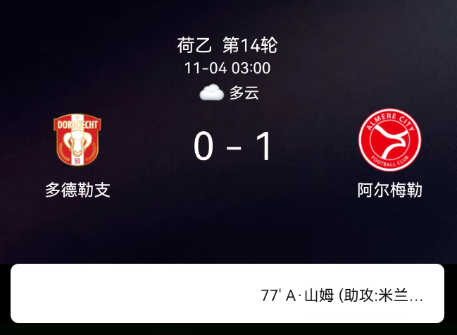 北京时间11月4日,荷兰乙级联赛第14轮,多德勒支主场对阵阿尔梅勒城。第48分钟,阿尔梅勒城吃黄牌;第77分钟,福阿-萨姆破门,阿尔梅勒城1-0;第79分钟,多德勒支吃黄牌;补时阶段双方各吃2张、1张黄牌。最终比分,多德勒支0-1阿尔梅勒城。