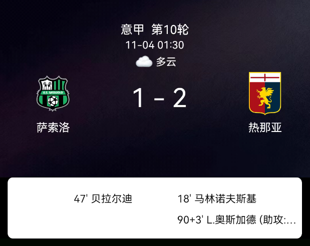 北京时间11月4日,意大利足球顶级联赛第10轮,萨索洛主场迎战热那亚。第3分钟,热那亚吃首张黄牌;第18分钟,马利诺夫斯基破门,热那亚1-0;第47分钟,贝拉尔迪破门,萨索洛1-1;补时第2分钟,萨索洛穆哈雷莫维奇吃黄牌;补时第3分钟,厄斯蒂高破门,热那亚2-1。最终比分,萨索洛1-2热那亚。