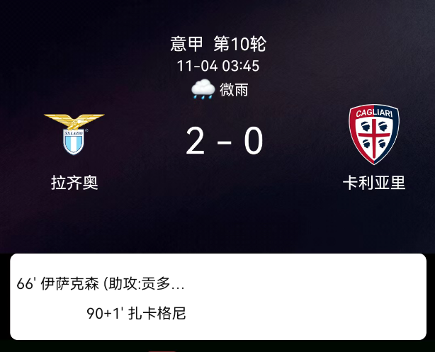 北京时间11月4日,意大利足球顶级联赛第10轮,拉齐奥主场迎战卡利亚里。第59分钟,费利奇吃黄牌;第65分钟,伊萨克森破门,拉齐奥1-0;第90+1分钟,扎卡尼破门,拉齐奥2-0。最终比分,拉齐奥2-0卡利亚里。