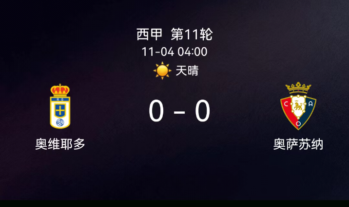 北京时间11月4日,西班牙足球甲级联赛第11轮,皇家奥维耶多主场对阵奥萨苏纳。第31分钟,奥萨苏纳吃黄牌;第58分钟,皇家奥维耶多吃黄牌;全场双方均未破门。最终比分,皇家奥维耶多0-0奥萨苏纳。