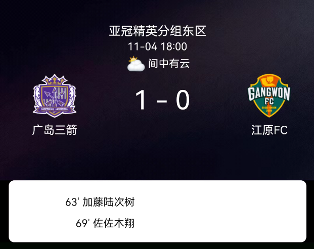 北京时间11月4日,亚足联冠军精英联赛第4轮,广岛三箭对阵江原。第63分钟,K加藤-陆次树破门,广岛三箭1-0;第69分钟,佐佐木翔染红,广岛三箭十人应战。最终比分,广岛三箭1-0江原。