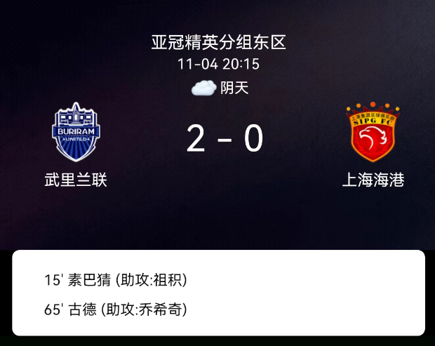 北京时间11月4日20:15,亚足联冠军精英联赛第4轮,上海海港客场对阵武里南联。第15分钟,素巴猜破门,武里南联1-0;第65分钟,古德破门,武里南联2-0。最终比分,上海海港0-2武里南联。