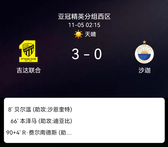 北京时间11月5日00:00,亚足联冠军精英联赛第4轮,吉达联合对阵沙迦。第8分钟,贝尔温破门,吉达联合1-0;第66分钟,本泽马破门,吉达联合2-0;补时第4分钟,罗热-费尔南德斯破门,吉达联合3-0。最终比分,吉达联合3-0沙迦。