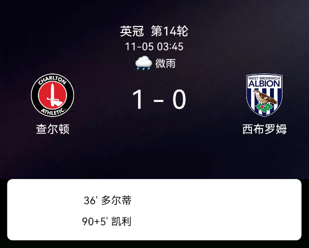 北京时间11月5日,英格兰足球冠军联赛第14轮,查尔顿主场对阵西布朗。第36分钟,多彻蒂罚丢点球;第58分钟,西布朗吃黄牌;补时第5分钟,凯里破门,查尔顿1-0。最终比分,查尔顿1-0西布朗。