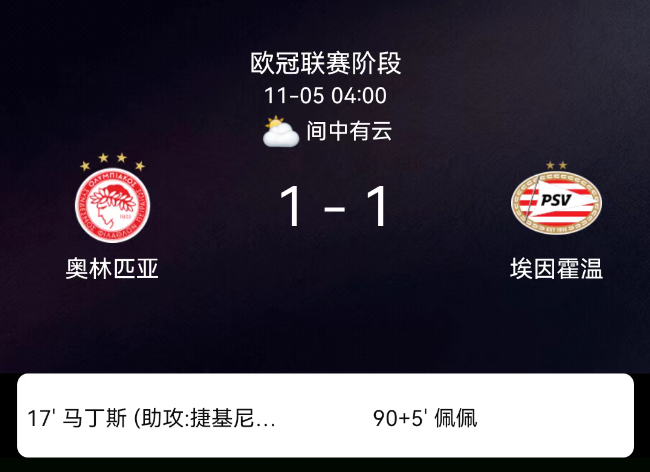 北京时间11月5日,欧冠联赛第4轮,奥林匹亚科斯主场对阵PSV埃因霍温。第17分钟,热尔松-马丁斯破门,奥林匹亚科斯1-0;第63分钟,PSV埃因霍温吃黄牌;第89分钟,西皮奥尼吃黄牌;补时第3分钟,佩皮破门,PSV埃因霍温1-1。最终比分,奥林匹亚科斯1-1PSV埃因霍温。