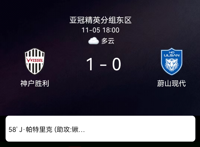 北京时间11月5日,亚足联冠军精英联赛第4轮,神户胜利船主场对阵蔚山HD。第58分钟,锹先祐弥助攻,帕特里克破门,神户胜利船1-0。全场无红黄牌判罚,最终比分,神户胜利船1-0蔚山HD。