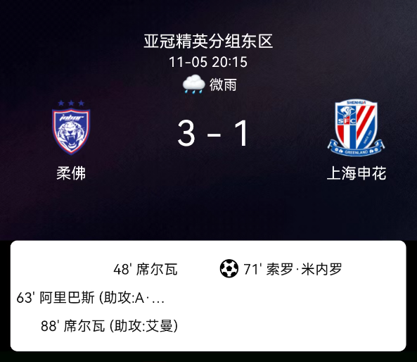 北京时间11月5日,亚足联冠军精英联赛第4轮,柔佛新山主场对阵上海申花。第47分钟,霍纳坦-席尔瓦破门,柔佛1-0;第63分钟,阿里瓦斯破门,柔佛2-0;第71分钟,米内罗点射,申花1-2;第81分钟,特谢拉-米内罗双双染黄;第87分钟,霍纳坦-席尔瓦再破门,柔佛3-1。最终比分,柔佛新山3-1上海申花。