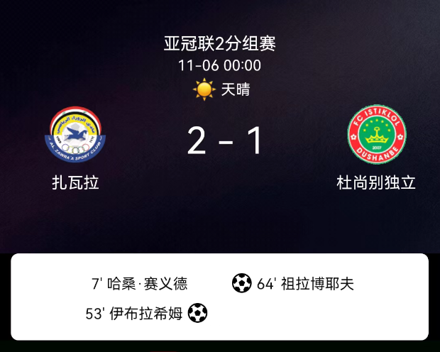 北京时间11月6日,亚足联冠军联赛二级联赛小组赛第4轮,扎瓦拉对阵杜尚别独立。第7分钟,哈桑-赛义德破门,扎瓦拉1-0;第53分钟,易卜拉欣-托米瓦点射,扎瓦拉2-0;第64分钟,茹拉博耶夫点射,杜尚别独立1-2。全场无红黄牌判罚,最终比分,扎瓦拉2-1杜尚别独立。