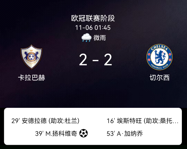 北京时间11月6日,欧冠联赛第4轮,卡拉巴赫主场对阵切尔西。第16分钟,埃斯特旺破门,切尔西1-0;第29分钟,安德拉德破门,卡拉巴赫1-1;第39分钟,扬科维奇点射,卡拉巴赫2-1;第52分钟,加纳乔破门,切尔西2-2;第90+1分钟,凯塞多吃黄牌。最终比分,卡拉巴赫2-2切尔西。