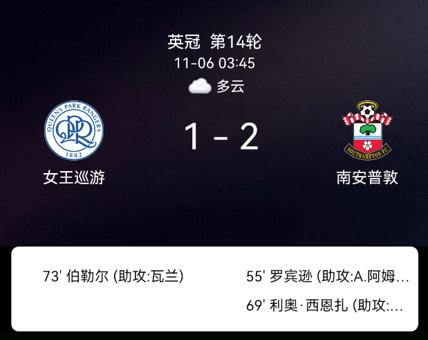 北京时间11月6日,英格兰足球冠军联赛第14轮,女王公园巡游者主场对阵南安普顿。第55分钟,杰伊-罗宾逊破门,南安普顿1-0;第62分钟,女王公园吃黄牌;第69分钟,莱奥-斯恩萨破门,南安普顿2-0;第73分钟,伯勒尔破门,女王公园1-2。最终比分,女王公园巡游者1-2南安普顿。