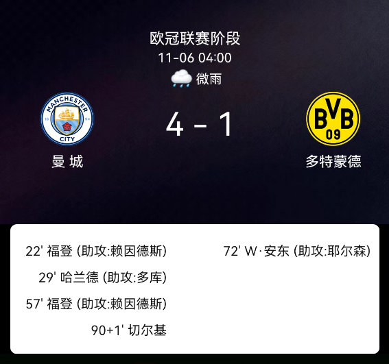 北京时间11月6日,欧冠联赛第4轮,曼城主场对阵多特蒙德。第14分钟,斯文松吃黄牌;第22分钟,福登兜射破门,曼城1-0;第29分钟,哈兰德爆射破门,曼城2-0;第57分钟,福登再兜射破门,曼城3-0;第72分钟,安东推射破门,多特1-3;第90分钟,谢尔基远射破门,曼城4-1。最终比分,曼城4-1多特蒙德。