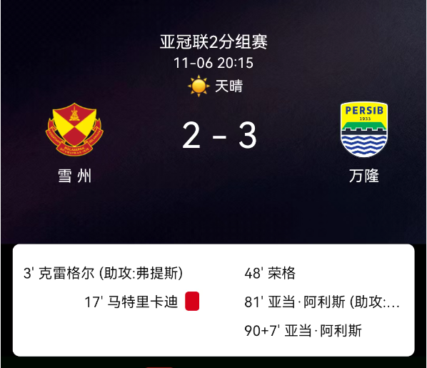北京时间11月6日,亚足联冠军联赛二级联赛小组赛第4轮,雪州主场对阵万隆。第3分钟,奇里戈尔破门,雪州1-0;第17分钟,马特里卡尔迪自摆乌龙,雪州2-0;第48分钟,安德鲁-容破门,万隆1-2;第59分钟,雪州吃黄牌;第81分钟,阿利斯破门,万隆2-2;补时第7分钟,阿利斯再破门,万隆3-2。最终比分,雪州2-3万隆。
